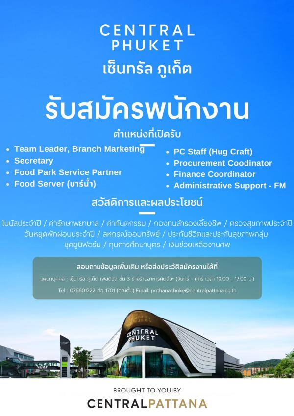 Central Phuket (Central Pattana) กำลังมองหาเพื่อนร่วมงานที่มีไฟและพร้อมจะเติบโตไปกับเรา และอยากท้าทายความสามารถในองค์กรระดับประเทศ เราเปิดรับสมัครตำแหน่งดังนี้: